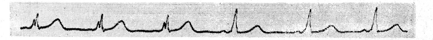 В., 6,5 лет (рис. 3). На ЭКГ регистрируется синдром WPW при наличии двух дополнительных путей. Во II отведении 1, 2, 3, 4, 5, 6-й комплексы типичны для синдрома WPW—они имеют короткий PQ, дельту-волну и расширение QRS. Комплексы QRS 1, 2, 3-й однотипны по своей форме и амплитуде, однако имеют выраженную аберрантность к 4, 5, 6-м комплексам; последние также однотипны.