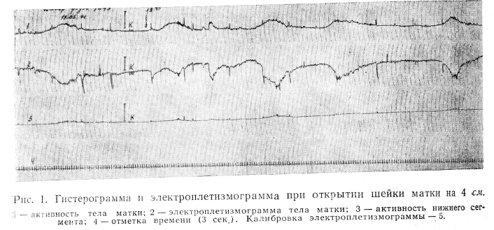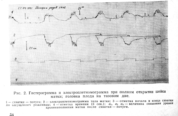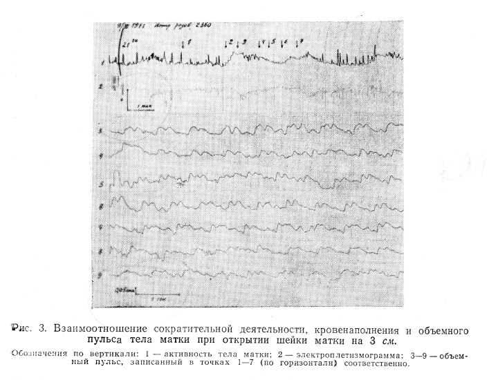 Большой интерес представляет изучение соотношений между гемодинамикой и моторной деятельностью матки во время беременности и в родах. В литературе мы не встретили работ, отражающих одновременно кровенаполнение и объемный пульс матки в родах. Изучение этих показателей позволило бы более полно оценивать гемодинамику матки и ее функциональное состояние. Одновременная регистрация медленных изменений кровенаполнения и объемного пульса матки дает возможность учитывать раздельно реакции артерий и вен органа.