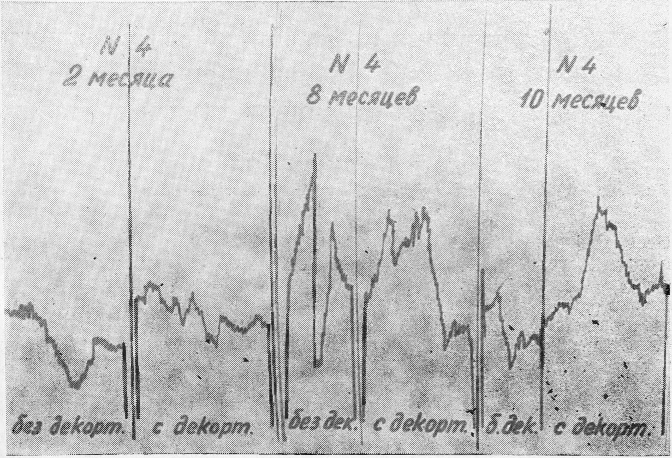 Остеомикрофотометрические исследования рентгенограмм оперированных конечностей позволили также установить значительную разницу в динамике изменений плотности костного вещества в опытах с декортикацией по сравнению с опытами, проведенными без декортикации (рис. 5).