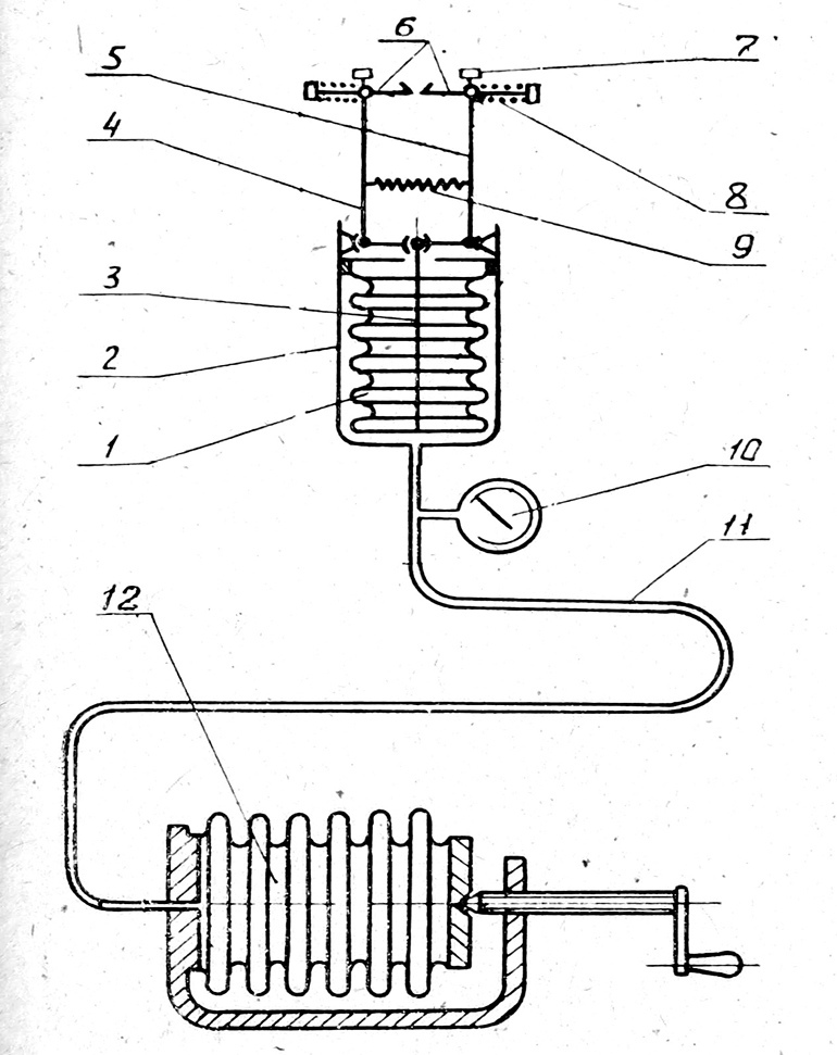 Ранотензиометр (рис. 1) представляет собой сильфонный блок (1), герметически закрытый кожухом (2). С дном сильфонного блока 'связан шток свободный конец которого шарнирно соединен со встречно расположенными рычажными механизмами (4, 5), несущими на себе прихваты (6) для подсоединения к объекту исследования. Прихваты могут перемещаться по пазу рычага за счет пружин (5) и закрепляются на рычаге винтами (7). Для выбора люфтов в шарнирах рычажного механизма использована винтовая пружина (8).