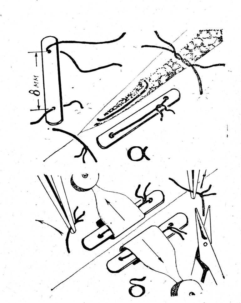 Рис. 2. Накожное пришивание металлических пластинок (а); прихваты ранотензиометра зацеплены за металлические пластинки, узловые швы снимаются (б).