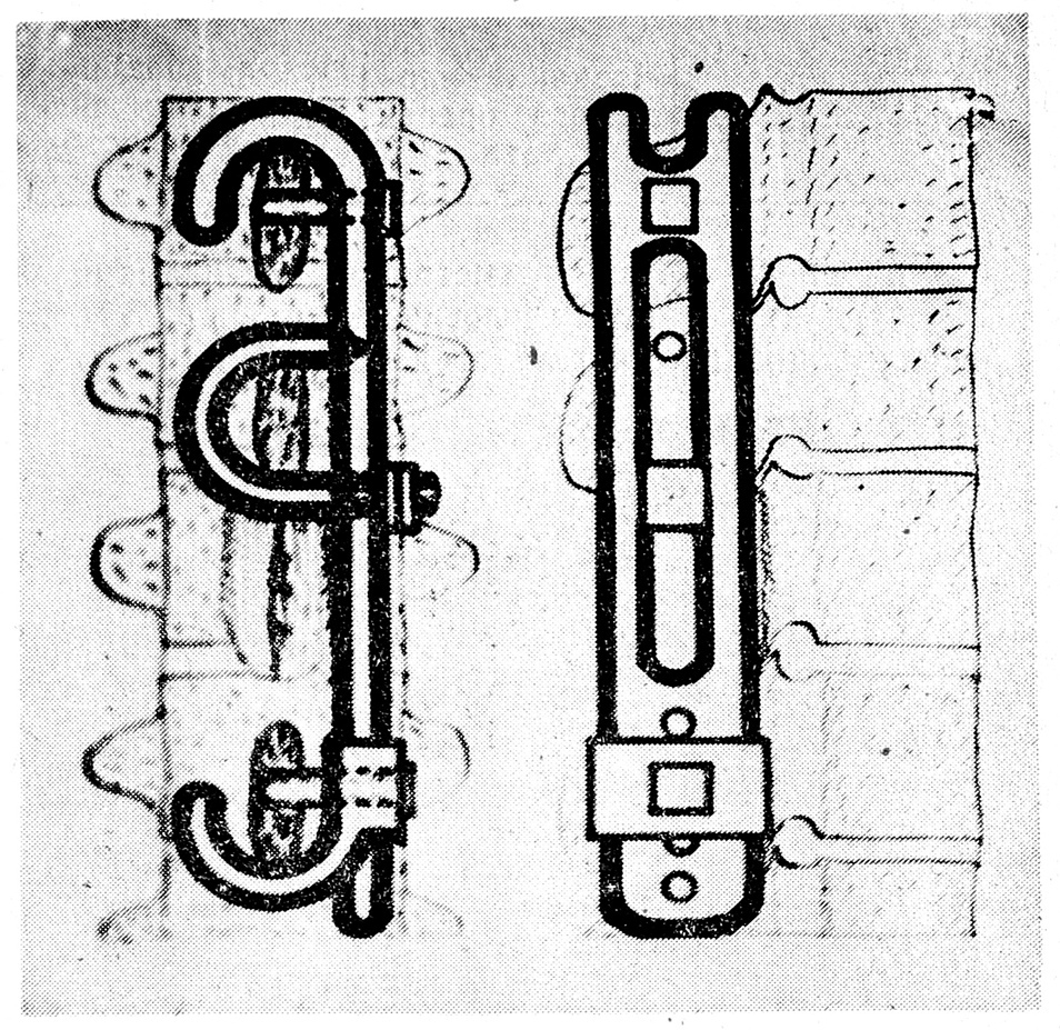 До 1975 г. при осложненных переломах грудного и поясничного отделов позвоночника нами применялись пластинка ЦИТО и другие фиксаторы [2]. В дальнейшем, убедившись в ненадежности известных методов фиксации позвоночника, мы создали собственное устройство (авторское свидетельство № 825042), а также разработали способ фиксации тел позвонков за остистые отростки, осуществляемый дорзальным доступом. Устройство состоит из двух частей, соединенных между собой таким образом, что их можно перемещать и фиксировать одну относительно другой. Пластинки имеют на своих концах крючки для наложения на остистые отростки и винты, расположенные перпендикулярно к ее продольной оси (рис. 1, 2).