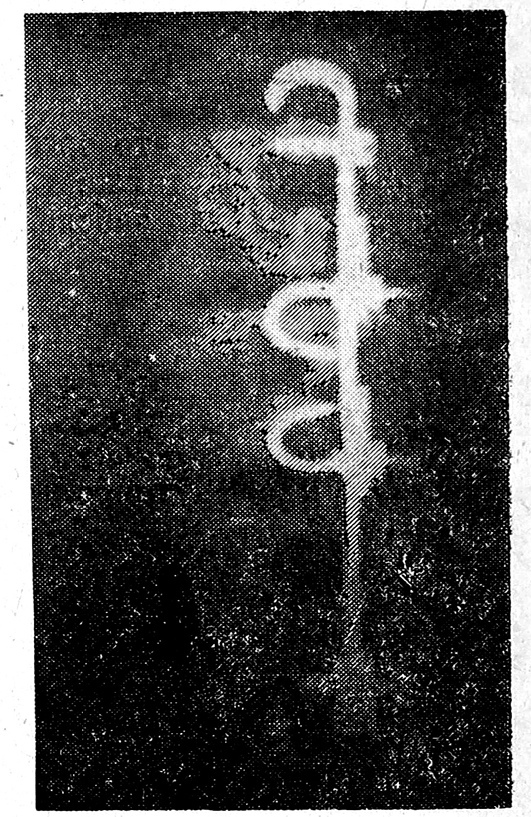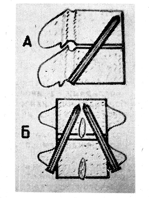 Устройство снабжено также промежуточными крючками. Если предлагаемое нами устройство для фиксации позвоночника или конструкции других авторов невозможно или нецелесообразно применять, длй обеспечения неподвижности поврежденного сегмента позвоночника и спинного мозга осуществляем фиксацию позвонков одним или двумя костными или металлическими штифтами, которые вводим в тела двух смежных неустойчивых позвонков через межпозвонковый диск навстречу друг другу под углом-не более 60°. Эти костные или металлические штифты проводим в туннели в телах позвонков, предварительно созданные шилами, введенными в направлении от нижнего края основания . поперечного отростка нижележащего позвонка вперед и вверх к передневерхнему углу тела вышележащего позвонка. Такая фиксация позвонков производится тем же доступом, что и при ламинэктомии (рис. 3, 4).