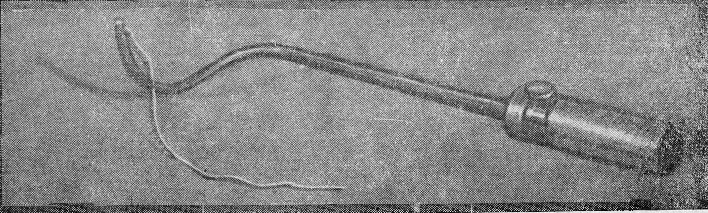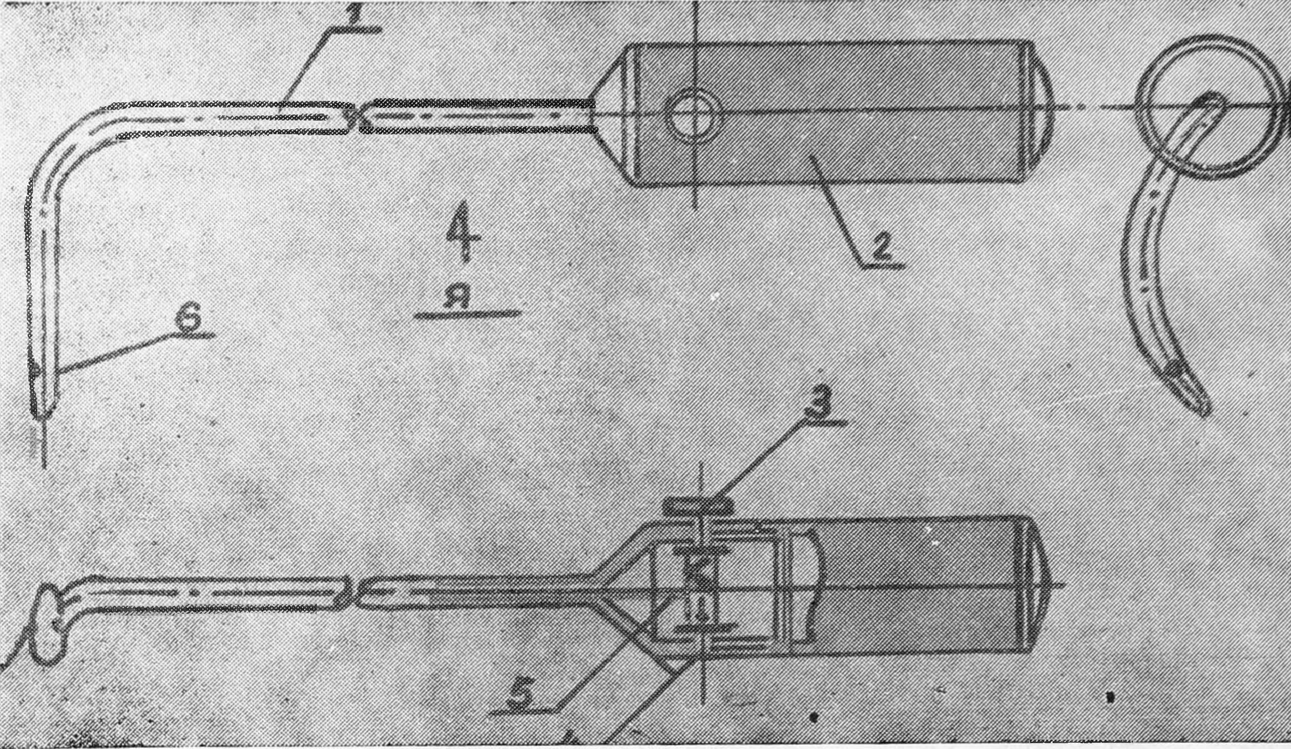 При лигировании почечных сосудов и мочеточника в процессе нефрэктомии мы пользуемся лигатурной иглой непрерывной нити (рис. 1, 2). Игла представляет собой полый стержень 1 со сферически закрытым концом, изогнутый в рабочей части по типу иглы Дешана и жестко соединенный с полой рукояткой 2, состоящей из двух половинок, которые соединяются резьбой. В дистальной части полой рукоятки по диаметру расположены две вырезки, предназначенные для укладки оси катушки 4 с лигатурой 5. На оси катушки просверлены два отверстия для одновременной фиксации двух лигатур, а в верхней части оси находится тормозная кнопка 3, которая выступает над уровнем рукоятки и при надавливании служит тормозом подачи лигатуры, выведенной через соосное отверстие 6 в рабочей части инструмента.