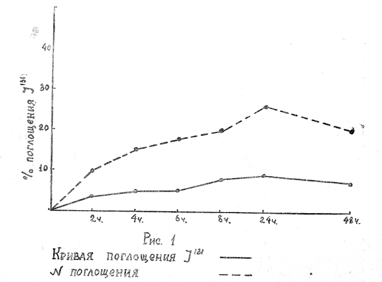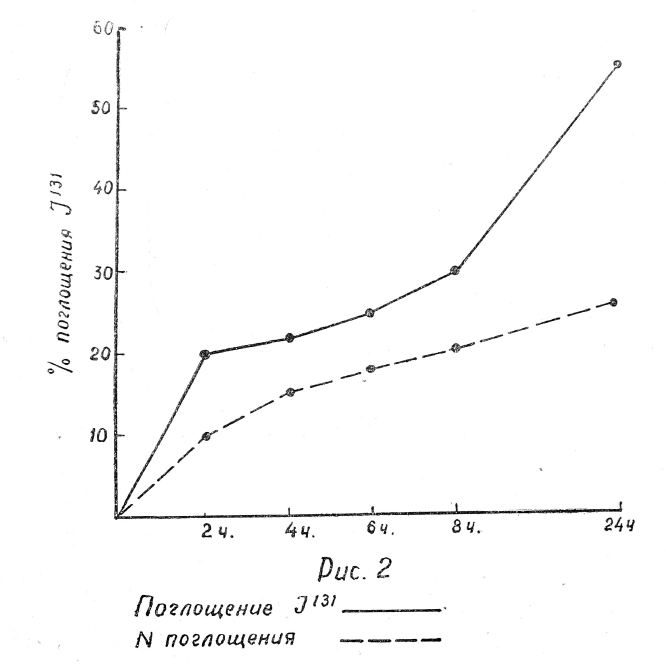 Для выявления функционального состояния щитовидной железы по радиойодному тесту мы пользовались общепризнанной методикой и определяли поглощение J131 через 2—4—6—24—48 часов после введения натощак 2 микрокюри препарата. Таким образом мы определяли скорость и величину поглощения. Максимальное поглощение в норме наблюдается через 24—48 часов и равно 15—30% (М. И. Фатеева, В. Г. Спесивцева и др.).