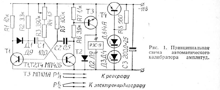 Мы разработали устройство для синхронной автоматической калибровки ЭКГ и РГ без внесения изменений в принципиальные электрические схемы регистрирующих приборов. Такое решение вопроса определялось необходимостью сохранения эксплуатационных характеристик приборов и облегчения согласования их с калибратором.