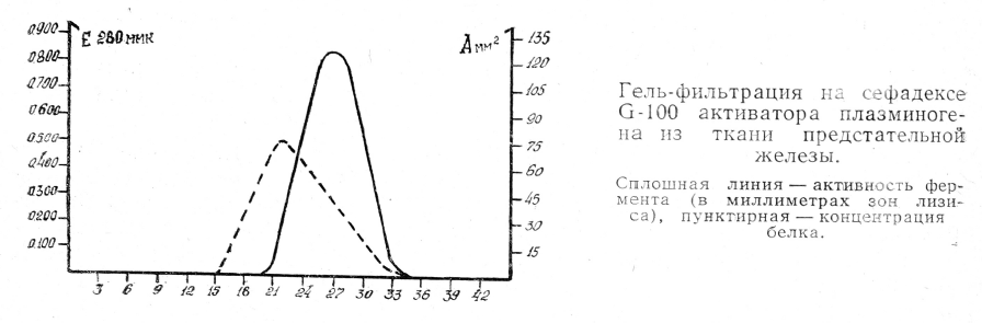 При гель-фильтрации активаторов плазминогена из различных тканей (см. рис.) ферменты элюировались после основного белкового пика; это свидетельствует о том,
