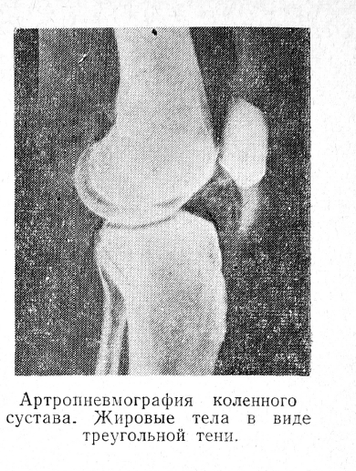 Для определения степени плотности жировых складок мы пользуемся пневмоартрографией коленного сустава, на которой плотные тела видны в виде треугольной тени между надколенником и суставными поверхностями коленного сустава (см. рис.).