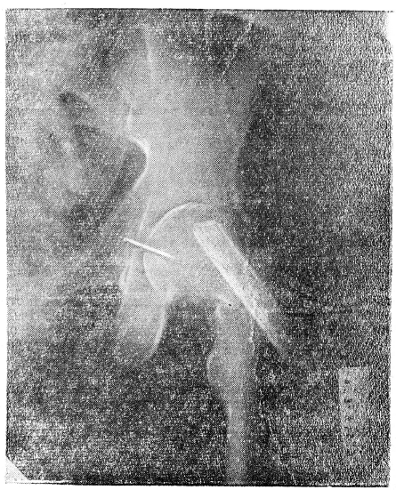 Высокий перелом бедренной кости. Металлический стержень из костномозгового канала вышел обратно, причем верхний конец его достигает уровня гребня крыла подвздошной кости.