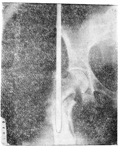 Кроме того, мы наблюдали трех больных, которым остеосинтез бедра произведен стержнем с навинчивающейся головкой (типа Азербайджанского ВОСХИТО). У этих больных головка стержня отвернулась и, еще задолго до удаления, находилась в мягких тканях на некотором расстоянии от стержня (рис. 3).