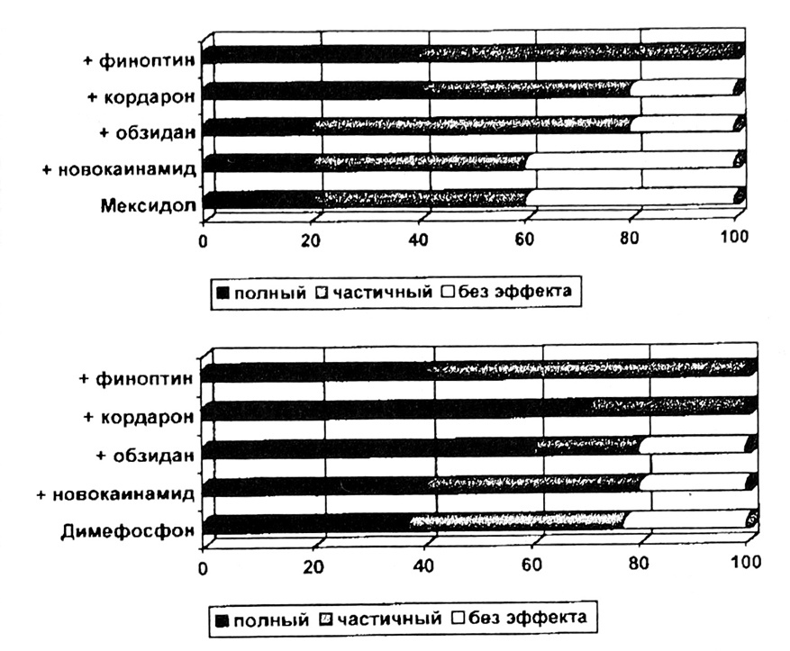 Нами изучена эффективность комплексной терапии рефрактерных к нейрометаболической и традиционной антиаритмической терапии нарушений сердечного ритма (см. рис.). Всем больным на фоне введения мексидола или димефосфона назначали внутрь индивидуально подобранные классические антиаритмические средства различных классов: 10 больных получали новокаинамид (15—20 мг/сут), 10 — анаприлин или обзидан (0,5—1 мг/кг сут), 25 — кордарон (5 мг/кг сут) и 10 — финоптин или верапамил (1—2 мг/кг сут). Взаимодействие препаратов в большинстве случаев сопровождалось потенцированием их терапевтического действия. Причем, согласно нашим наблюдениям, наибольший синергизм эффектов отмечался при сочетании мексидола с финоптином, а димефосфона с кордароном.