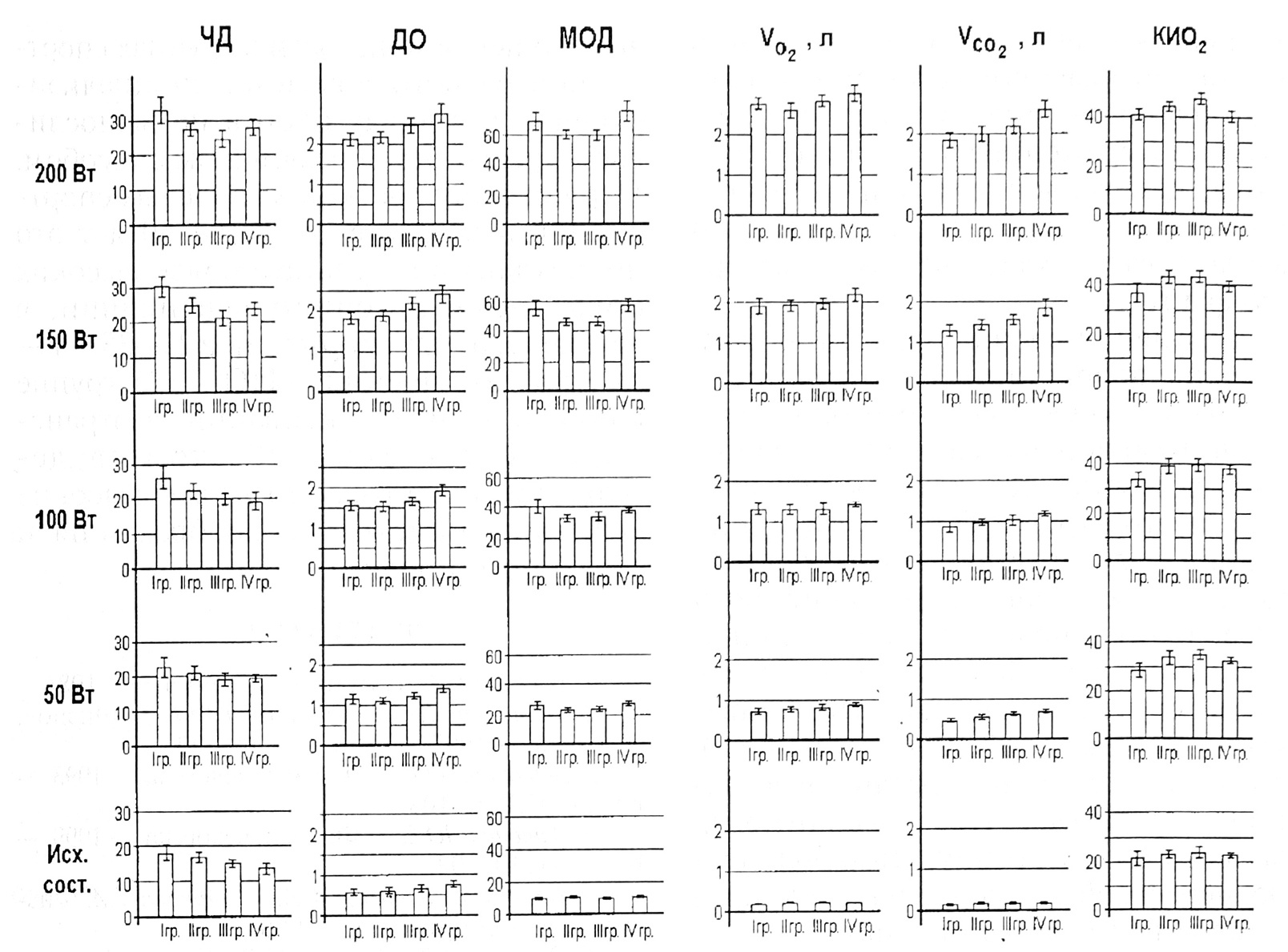 Нагрузка на велоэргометре мощностью в 50 Вт и 100 Вт привела к изменению всех показателей внешнего дыхания в исследуемых группах. Однако межгрупповые различия проявились только в отношении ДО и ЧД. По остальным параметрам достоверных различий не обнаружено.