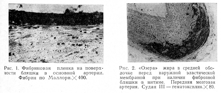 Мы предлагаем выделять ряд типов поражений ГГБ крупных и мелких сосудов мозга. ГГБ церебральных артерий и вен в условиях атеросклероза различной степени выраженности (при изучении измененных и видимо не измененных участков сосудов) могут «блокироваться» в отдельных случаях фибриновыми пленками, откладывающимися на интиме (рис. 1). В других случаях мы видим признаки их «декомпенсации»