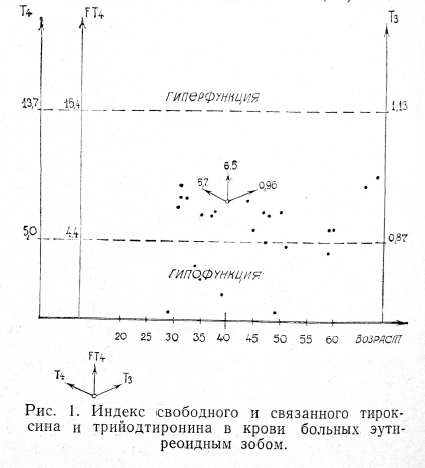 Сопоставление индекса свободного тироксина с уровнем холестерина в крови у больных зобом выявило характерную закономерность — низкому индексу свободного тироксина соответствовал высокий уровень холестеринемии. Коэффициент корреляции между этими показателями равнялся — 76.