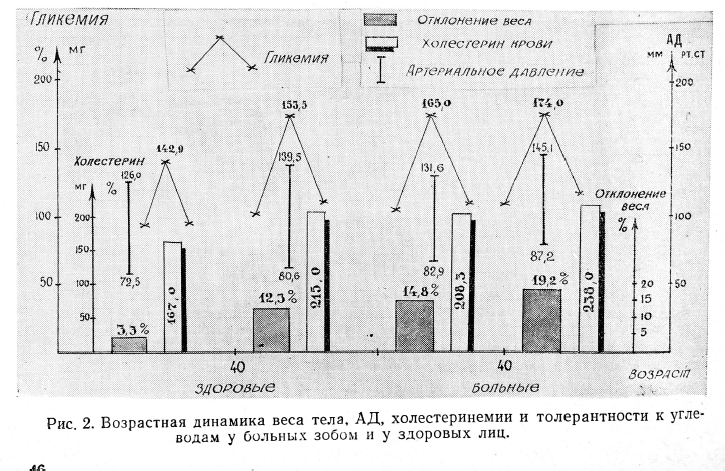 Выявленное нами у всех обследованных снижение толерантности к углеводам по мере увеличения возраста у больных зобом оказалось более выраженным, чем у здоровых лиц. Таким образом, у больных зобом по мере старения снижается толерантность к углеводам, нарастает АД, увеличивается холестеринемии и вес тела, т. е. происходят те же возрастные процессы, что и у здоровых лиц, но в более выраженной форме (рис. 2).