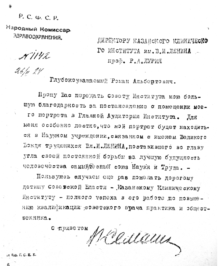 института, постановлением Совета института его портрет был помещен в главной аудитории клиники (ныне кафедра терапии № 1). В ответ на указанное решение Н. А. Семашко прислал проф. Р. А. Лурия очень теплое и трогательное письмо. Подлинник письма хранится в Казанском ГИДУВе. В литературе, посвященной жизни и деятельности первого наркома здравоохранения страны Н. А. Семашко, указанное письмо не упоминается. Учитывая исторический интерес этого документа, мы позволили себе привести его в данной статье.