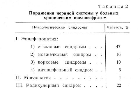 Хронический пиелонефрит—отнюдь не местное заболевание почек. Раздражение нервных окончаний при глубоком и длительном воспалении у больных, особенно у женщин, сопровождается поражением нервной системы на различных уровнях. Было установлено, что при хронических пиелонефритах возникают отклонения на электроэнцефалограмме: основные ритмы ЭЭГ отсутствуют, доминирует медленная активность — тета- и дельта-волны, максимальная амплитуда волн достигает 80 мкв; на этом фоне регистрируются билатерально синхронные разряды высокоамплитудных (до 100 мкв) волн частотой 2—4 гц. Вовлекаются в процесс стволовые отделы и мозжечок, а также периферические нервы. В соответствии с этим у больных наблюдаются синдромы астении и неврозов, упорные фиксированные болевые ощущения не только в поясничной области, но и в животе (не по типу колик), нарушения сосудистого характера, а также проявления вторичных радикулоневритов конечностей меняется и психологическое состояние нефритом.
