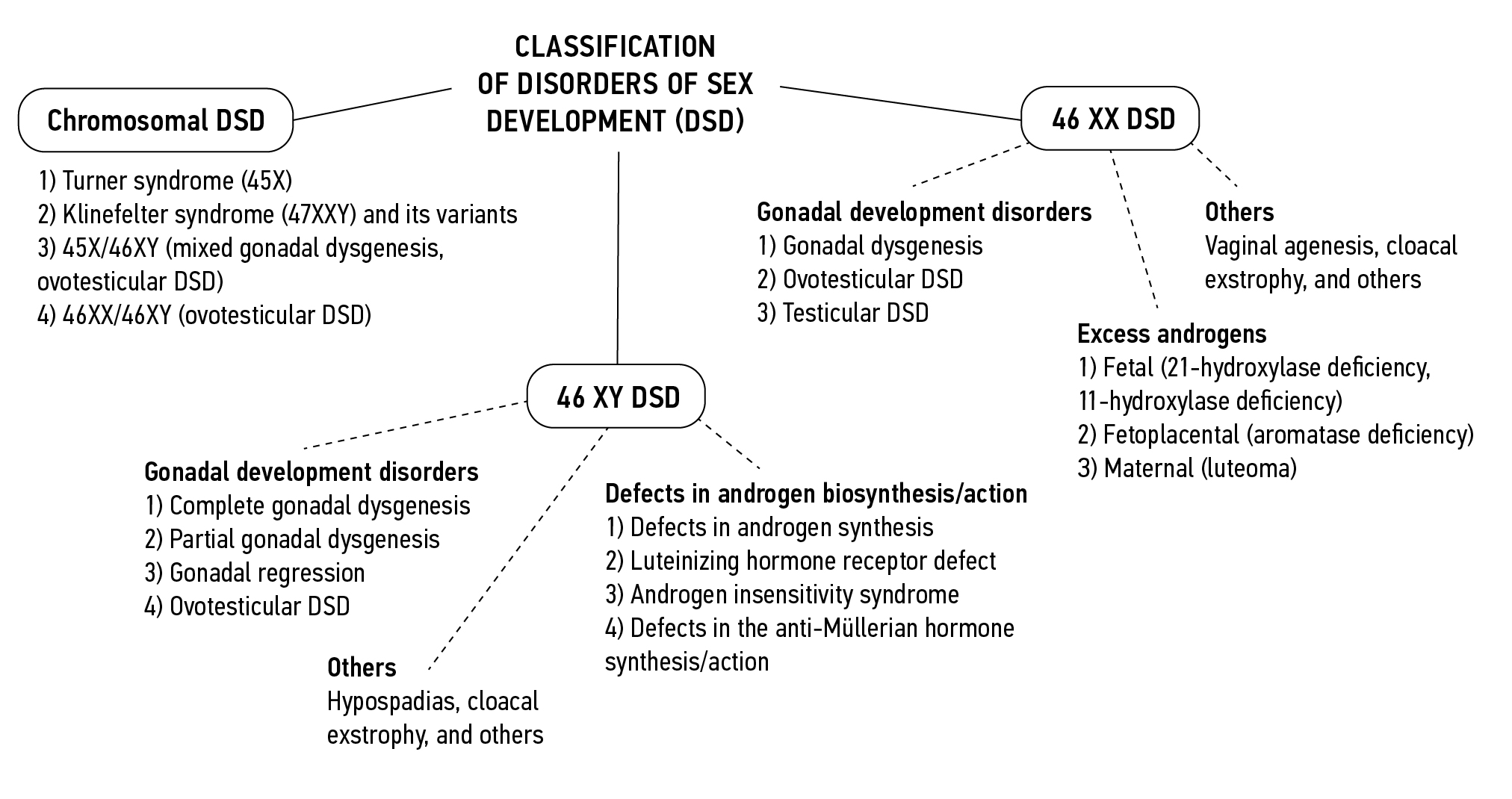 The classification includes three main groups: chromosomal DSD, 46 XY DSD, and 46 XX DSD. Individuals with 46 XY DSD present with ambiguous or female external genitalia caused by incomplete intrauterine masculinization and the presence or absence of Müllerian structures. The pathogenesis-based classification of 46 XY DSD includes several subgroups: gonadal development disorders, defects in androgen biosynthesis or action, and other sex-related pathologies (Fig. 1) [2].