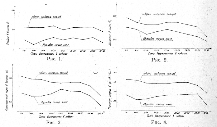 С наступлением беременности в организме женщины происходит функциональная: перестройка применительно к новым условиям жизнедеятельности. В настоящем сообщении приведены результаты изучения электро-возбудимости скелетных мышц у беременных (двуглавой мышцы плеча и поверхностного сгибателя пальцев руки) путем- построения кривых силы — длительности [1, 2].