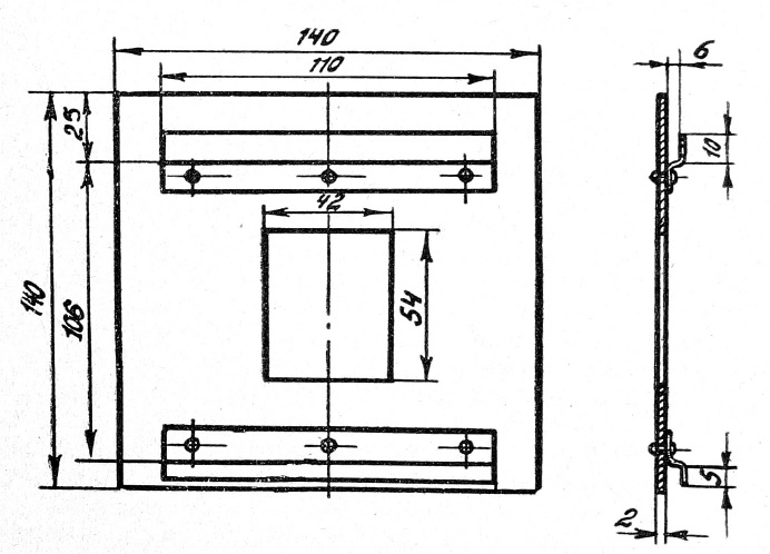 Подбородочник подвешивается сзади на стенку экранного комплекса, на котором заранее начерчен размер кассеты 13x18 см после предварительного просвечивания без больного, что делается всего один раз. Для ограничения потока рентгеновых лучей и уменьшения вторичного излучения в окно за диафрагмой и фильтром аппарата устанавливается свинцовая пластинка размером 140х140 мм с прорезью в центре 42x54 мм (рис. 2).