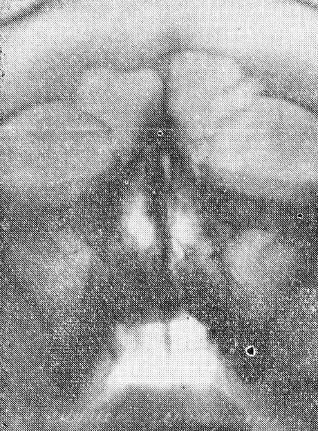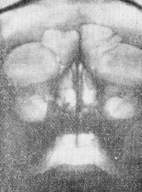 При помощи данного приспособления можно производить снимки придаточных пазух в вертикальном положении больного на аппаратах всех систем, внося при необходимости несущественные изменения. Мы производили снимки на аппарате УРДд-110-К4 при режиме: большой фокус, 67 кв, 50 МА, экспозиция 2,5 сек, фокусное расстояние 67 см (рис. 3, 4).