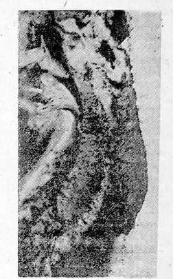 Рис. 1. Между мощным слоем фибрина и миокардом светлая полоса опухолевой ткани. Вверху видны прорастание ею ушка предсердия и замурованная в ней коронарная артерия. Макропрепарат.