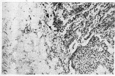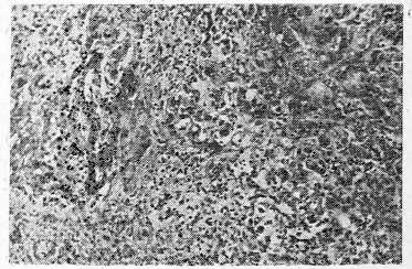 Рис. 3. Опухоль печени. Справа печеночная ткань, инфильтрируемая опухолевыми клетками. В центре левой половины участок опухоли трабекулярного строения. Гематоксилин-эозин. X 200.