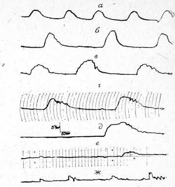 В последующие дни послеродового периода отмечалось постепенное уменьшение контрактильной активности миометрия (см. табл.). На 7-й день послеродового периода на гистерограммах регистрировались низкоамплитудные непродолжительные и частые сокращения матки, а у некоторых родильниц не было записано ни одной волны сокращения. Это можно объяснить хорошей контрактильной способностью матки уменьшением ее размеров, при котором сокращения матки носят преимущественно изометрический характер. В качестве примера на рис. представлены гистерограммы родильницы А. в динамике.