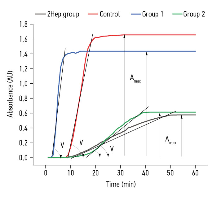 Fig. 1. Registration of fibrin polymerization kinetics by dynamic turbidimetry. Determined parameters: lag period (Lag) — time before the density increase; V — increase in optical density during its increase per unit time; Amax — maximum optical density at a given wavelength; control — group of healthy donors; group 1 — moderate course; group 2 — severe course, patients of the intensive care unit; group 2Hep — patients with severe course who did not receive heparin therapy