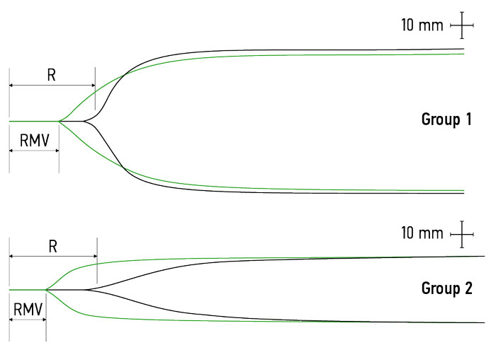 Fig. 2. Thromboelastograms demonstrating the effect of microvesicles on coagulation parameters, “typical” for each of the study groups (group 1 and group 2); R is the coagulation activation time of the native sample; RMV is the coagulation activation time after adding microvesicles to the sample