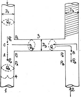 Сосуды 1 и 2 соеденены сосудом 3 (шунтом) под прямым углом. Условно принято, что диаметры их одинаковы, то есть D1=D=D3 и шунт не содержит клапанов. Через Qr, Q2, Q3 обозначаются расходы крови до и после разветвления в точке С, сосудах 1 и 3 соответственно. При соединении шунта с сосудом 7 под прямым углом расход крови Q3 в первом обусловлен избыточным статическим давлением Δр, являющимся следствием сжимаемости крови и эластичности стенки сосуда и вычисляется по формуле: