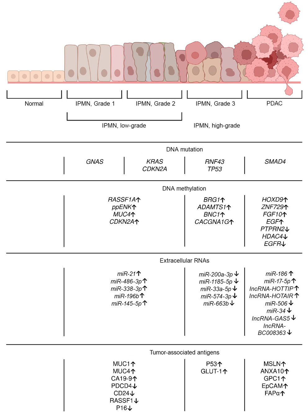 PDAC progresses through a series of transformations involving both genetic and epigenetic regulation of tumor cells, accompanied by changes in their antigenic profile (Fig. 1). A primary goal in the development of liquid biopsy is to identify specific alterations that are not only common among patients but also indicative of tumor presence [2].