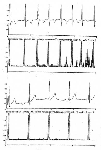 Указанный метод был использован для регистрации высокочастотных компонент (ВЧ компонент) ЭКГ-сигнала. В качестве примера рассмотрены регистрации с отведения Ѵ4 для пациентов с инфарктом миокарда. На рис. 2 приведены НЧ и ВЧ составляющие ЭКГ-сигнала больного инфарктом миокарда (1-й день заболевания, вверху) и здорового человека (внизу). В обоих случаях были проведены записи более 100 циклов, усиленных ЭКГ-сигналов отведения Ѵ4, при этом у здорового не были обнаружены ВЧ составляющие вне комплекса QRS. У больного инфарктом миокарда прослеживались периоды отсутствия ВЧ компоненты, сменявшиеся периодами появления ВЧ компоненты сначала на месте Т-волны, затем в виде поздних потенциалов желудочка (ППЖ), и весь интервал R—R заполняется ВЧ импульсами. На НЧ компонентах эта закономерность выражалась вначале в виде последовательного уменьшения R—R интервала, затем его максимального увеличения для циклов с большим содержанием ВЧ импульсов. Там, где появлялись ВЧ компоненты и Т-волны, НЧ составляющая этих зубцов имела меньшую амплитуду. Таким образом, общая амплитуда ЭКГ-сигнала (ВЧ+НЧ) оставалась постоянной. Наблюдавшаяся нами высокая корреляция между НЧ и ВЧ компонентами (0,7; Р <0,05 по критерию t Стьюдента), между ВЧ и R—R интервалом (0,63; Р <0,05 по критерию t Стьюдента), а также отсутствие ВЧ импульсов в некоторые моменты времени, свидетельствовали о том, что мы на самом деле регистрировали реальные потенциалы сердца (сравните с работами [8, 11]).
