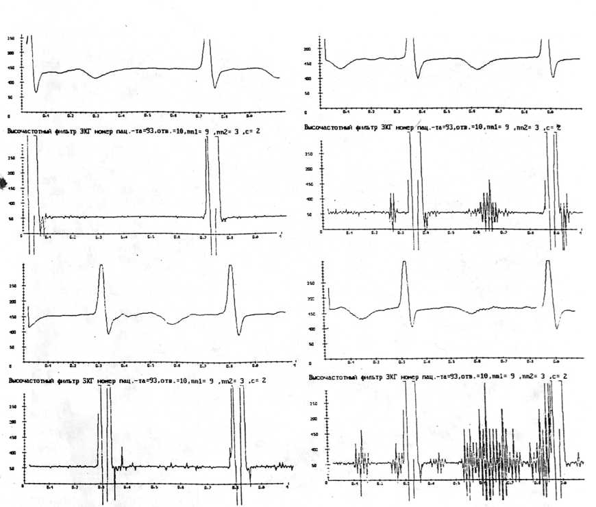 Последний метод позволяет регистрировать усиленный PQRST сигнал в каждом комплексе, но для снижения уровня шума применяется одновременно запись с нескольких пар близко расположенных электродов. Наш метод отличается от традиционных [11] отсутствием временного и пространственного усреднения, что, как известно из теории анализа сигналов [3], не дает искажений компонент реального сигнала, которые могут возникать при любом усреднении.
