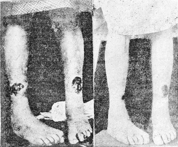Одни почти с начала лечения ощущали жжение и легкое покалывание в области язв; другие—несколько спустя и к концу лечения говорили о ломоте в ногах, сильной болезненности в язвах, например при взятии мазков, чего никогда раньше у наших больных не бывало.