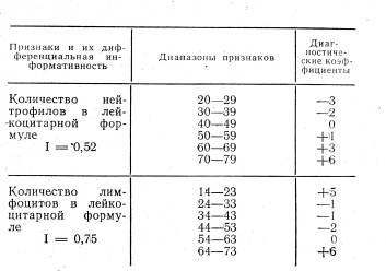 Мы не выявили изменений температуры, характерных для одного из состояний больного. Подсчет диагностических коэффициентов! показал, что данный симптом не является информативным для дифференциальной диагностики ОРЗ и присоединяющихся К НИМ: пневмоний, и поэтому он не был включен в последующем в диагностическую таблицу (I = 0,03). Оценка состояния кожных покровов', (бледность, цианоз) была достаточно информативна для суждения о присоедининии пневмонии (I =2,47). Кашель наблюдался не у всех больных, но если он имелся, это чаще говорило о присоединении пневмонии (ДК =+2). Информативность этого симптома для дифференциации ОРЗ и пневмоний составила 0,26. Появление одышки служит достаточно информативным признаком осложнения заболевания пневмонией (I= = 2,21). Информативность аускультативных и перкуторных изменений в легких тоже оказалась достаточно высокой (1=1,71; І=2,18). Клинические анализы крови произведены у 150 больных, в том числе у 69 с пневмонией. Информативность данных о количестве лейкоцитов, нейтрофилов, лимфоцитов для дифференциальной диагностики ОРЗ и пневмоний составила соответственно 0,66, 0,52, 075. Итак, в клинической симптоматике острых респираторных заболеваний наиболее информативны для диагностики осложнений пневмонией появление одышки, цианоза носогубного треугольника, аускультативные и перкуторные изменения в легких. Данные морфологического исследования периферической крови при ОРЗ и пневмониях у новорожденных весьма противоречивы, ряд этих показателей несет в себе определенную информацию, но не всегда позволяет судить о состоянии реактивности, защитно-адаптационных возможностях организма новорожденного при этой патологии.