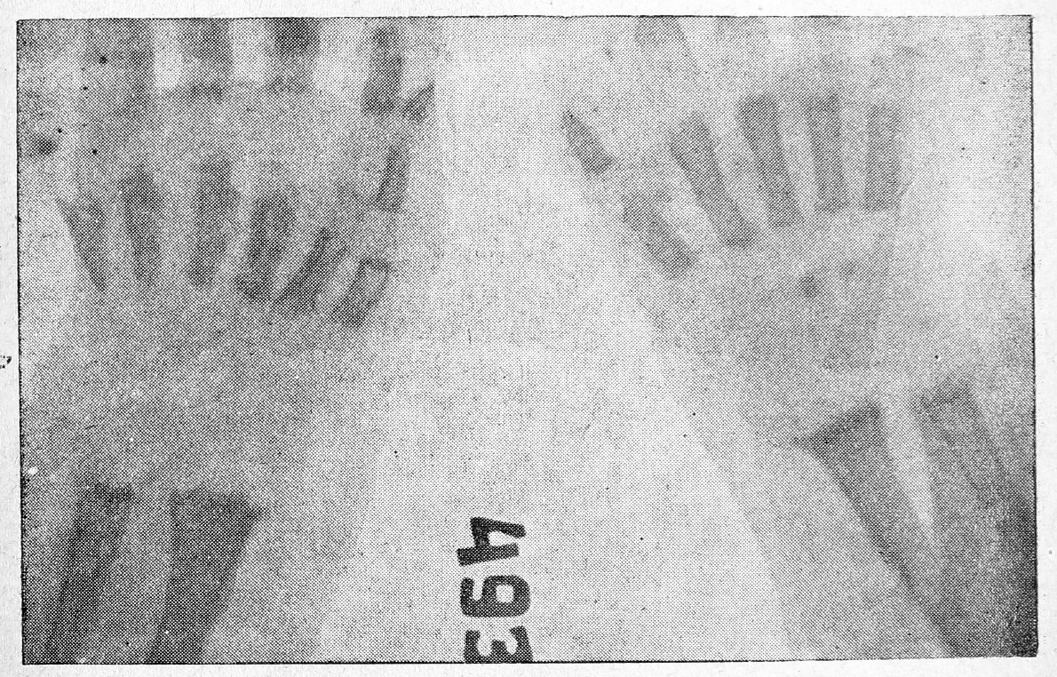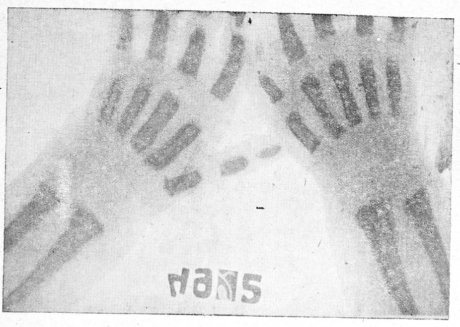 Снимок после лечения (2/ІV 35 г.). Интенсивная тень вновь образованной широкой зоны препараторного обызвествления, близко придвинувшиеся к метафизу лучевых и локтевых костей обеих рук. Блюдцеобразная форма дистальных метафизов лучевых и локтевых костей сохранилась в менее выраженной степени. Несколько больших размеров, четко контурированные ядра о capitatum и os hamatum (нежной костной структуры). Намечаются дистальные эпифизарные ядра окостенения обеих лучевых костей.