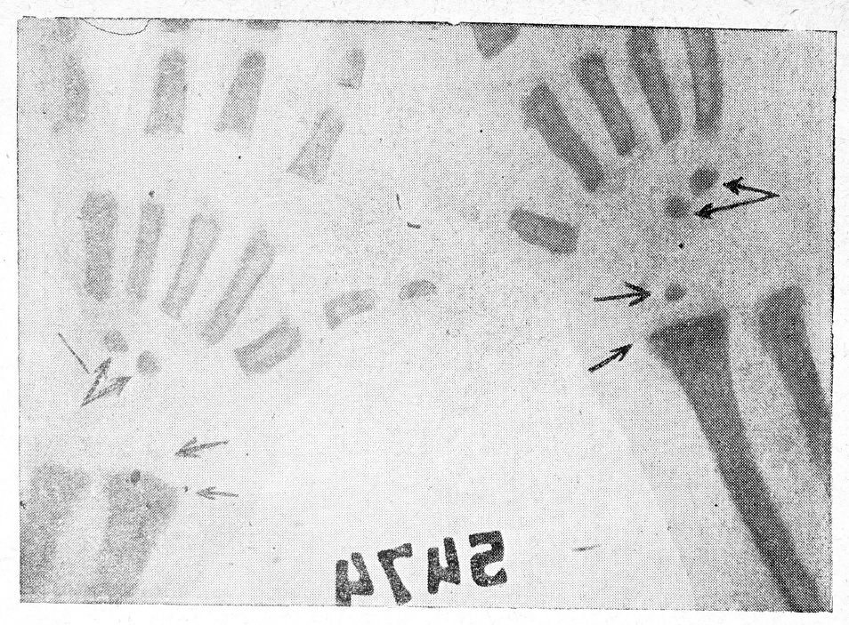 - Фрунзе С., 7 мес. Лечение с 23/II до 2/ІV 35 г. Снимок до лечения (23/II 35 г.): Резко выраженные рахитические зоны лучевых и локтевых костей обеих рук, а также менее выраженные рахитические зоны основных фаланг и карпальных костей кистей. Плохо контурируемые с нежной костной структурой ядра os capitatum и os hamatum, особенно на левой кисти.