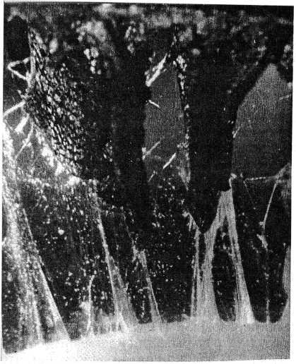 Рис. 2. Микроперфорации передней гиалоидной мембраны у экватора хрусталика вследствие вырывания из нее волокон цинковой связки. Напыление парами меди. ˟ 60.