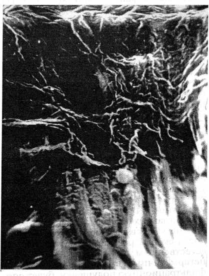 Рис. 1. Разрыв передней гиалоидной мембраны в области цилиарных отростков в результате смещения иридохрусталиковой диафрагмы к переди. Напыление парами меди. ˟ 40.