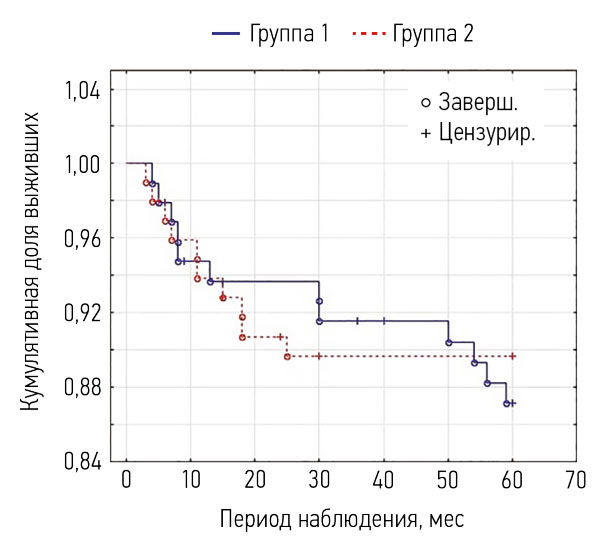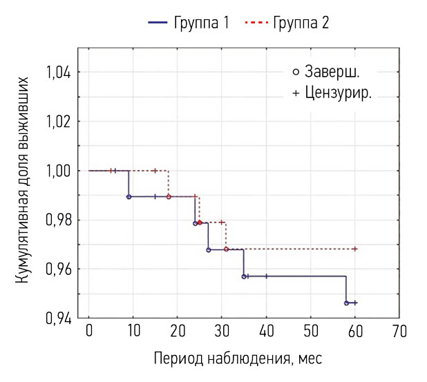 Пятилетняя выживаемость в 1-й группе составила 94,71%, а во 2-й — 96,74% (95% доверительный интервал 91,3–99,0%). Согласно рис. 2, кривые выживаемости в группах сравнения также не отличались (лог-ранговый критерий = 0,74; р=0,458).