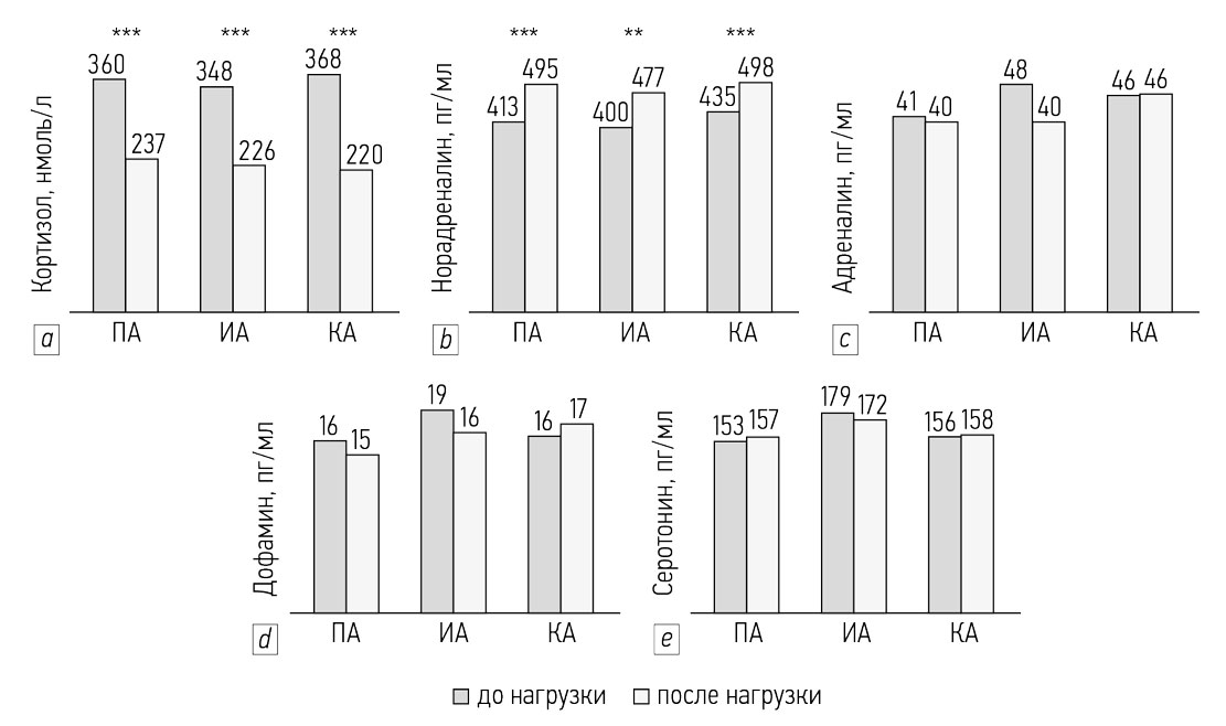 Рис. 1. Изменение гормональных показателей в группах пациентов до и после комплексной нагрузки у респондентов с преобладающей психомоторной активностью, с преобладающей интеллектуальной активностью и с преобладающей коммуникативной активностью (значимые различия обозначены звездочками: *** р <0,001, **р <0,01, *р <0,05). ПА — респонденты с преобладающей психомоторной активностью; ИА — респонденты с преобладающей интеллектуальной активностью; КА — респонденты с преобладающей коммуникативной активностью.
