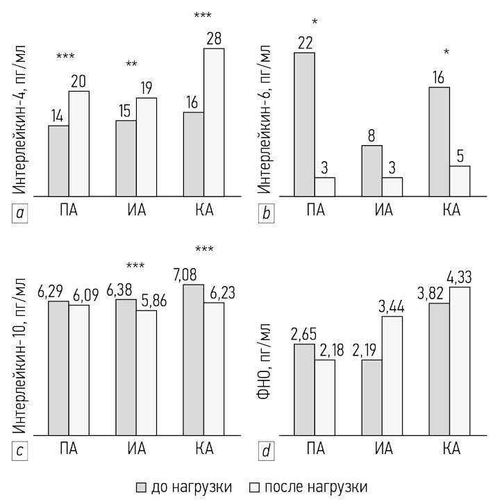 Рис. 2. Изменение иммунологических показателей (пг/мл) в группах респондентов с преобладающей психомоторной активностью, с преобладающей интеллектуальной активностью и с преобладающей коммуникативной активностью до и после комплексной нагрузки (значимые различия обозначены звездочками: *** р <0,001, **р <0,01, *р <0,05). ПА — респонденты с преобладающей психомоторной активностью; ИА — респонденты с преобладающей интеллектуальной активностью; КА — респонденты с преобладающей коммуникативной активностью.