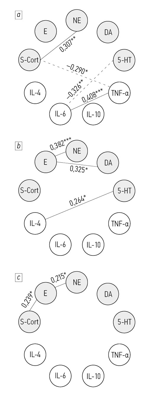 Настоящее исследование связано с поиском экспериментальных фактов, которые могли бы лечь в основу постановки гипотезы о специфичности изменения гормональных и иммунологических показателей под воздействием комплексной нагрузки у пациентов с разной доминирующей ТА. Выявлено, что у респондентов с преобладающей психомоторной активностью темперамента достоверно снижается уровень IL-6 в сыворотке крови; изменения уровня кортизола коррелируют с изменением уровня норадреналина; уровень IL-6 положительно связан с изменениями уровня TNF-α и отрицательно — с изменением уровня 5-HT. У респондентов с преобладающей интеллектуальной активностью темперамента достоверно снижается уровень IL-10; изменение уровня адреналина коррелирует с изменением уровня норадреналина и уровня дофамина; снижение уровня 5-HT достоверно связано с ростом уровня IL-4 в сыворотке кроки. У респондентов с преобладающей коммуникативной активностью темперамента достоверно снижается уровень IL-6 и уровень IL-10; изменение уровня адреналина коррелирует с изменением уровня норадреналина и уровня кортизола в сыворотке крови.