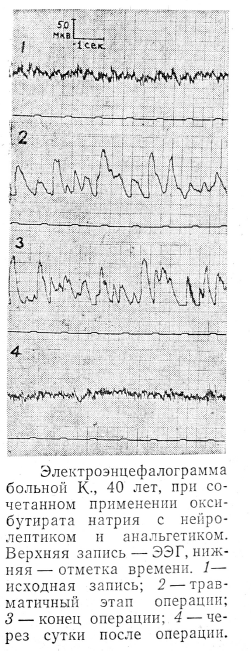 Электроэнцефалографический контроль свидетельствовал о достаточной глубине наркотического сна на всех этапах хирургического вмешательства и постепенном выходе из наркоза к концу операции (см. рис.). После пробуждения больных длительность анальгезии составляла не менее 4 ч.