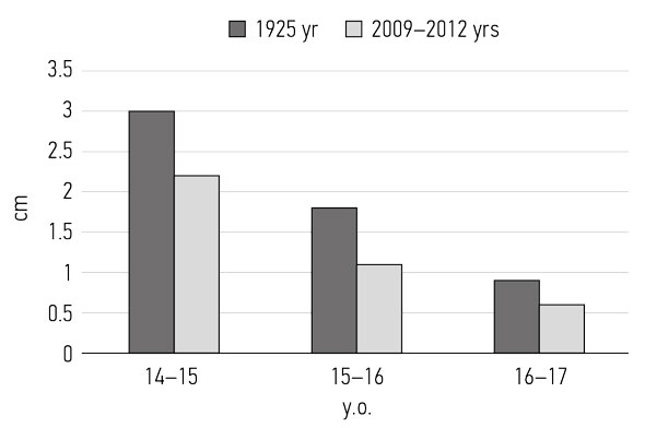 In the 1920s, the maximum annual increases in body length were observed in Moscow girls aged 14–15 years (Figure 1), whereas at the beginning of the 21st century, the maximum annual increases shifted to earlier periods. The maximum increase in body length was recorded in Moscow schoolgirls aged 11–12 years, and growth processes in most girls were complete by aged 16 years (the average value of weight gain from 16 to 17 years was <1 cm) (Table 2).