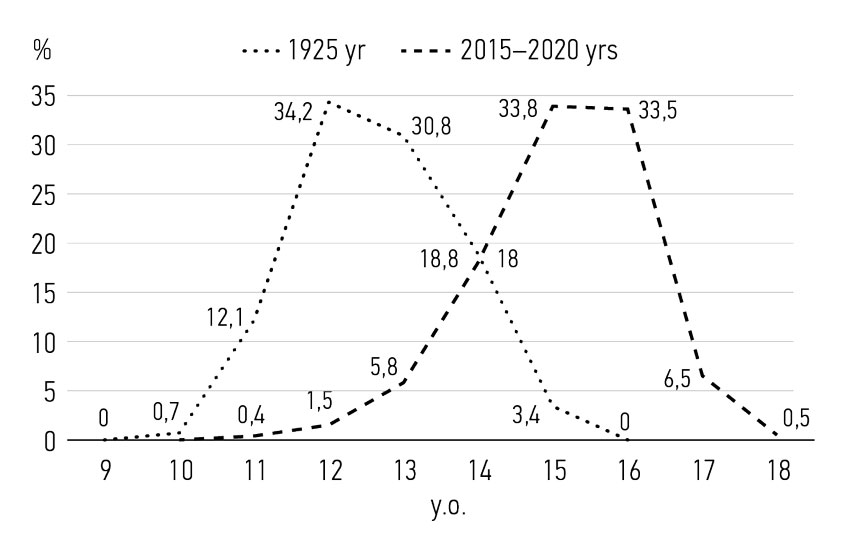 In 1925, menarche occurred at age 11 years in 0.4% of girls in Moscow and at age 10 years in 0.7% in 2015–2020. Moreover, in 1925, 33.8% of menarche cases occurred at the age of 15 and 33.5% of cases at the age of 16, and some girls experienced late menarche (delayed biological development). In 2015–2020, there was a significant shift in the age of menarche to earlier periods. In 34.2% of cases, menarche occurred at the age of 12 and in 30.8% at the age of 13 (p = 0.0357).
