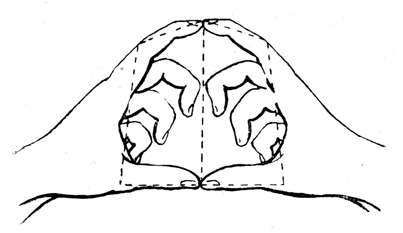 Одного взгляда на оба эти рисунка достаточно, чтобы увидеть в них большое сходство конфигурации. Помимо того, можно думать, что между размерами тазового кольца и размерами фигуры кистей рук существуют точные количественные совпадения. так что, следовательно, по расстояниям между различными пунктами сложенных кистей рук можно судить о столь интересующих врача - акушера размерах малого таза.