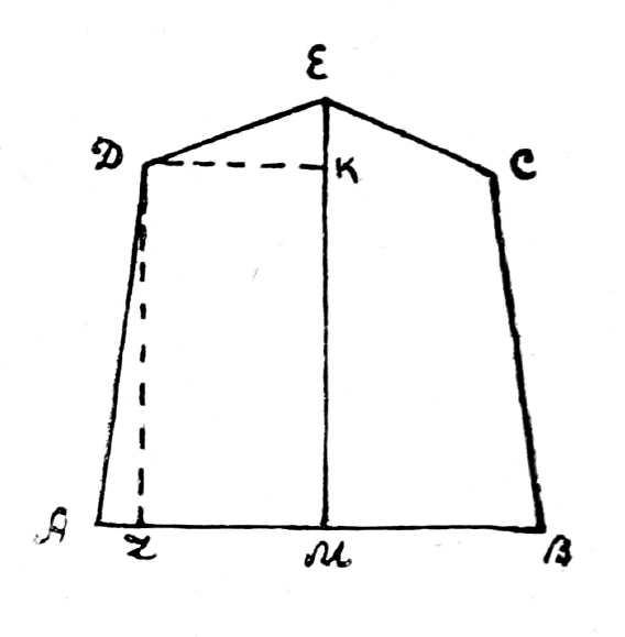 измерении фигуру на бумагу. Если мы соединим точки фиксации кон'югатомера прямыми, то получим изображенную на рис. 5 геометрическую фигуру. В этой фигуре угол при Е равен 130°. Пусть, далее, DE = EC = 6 см., AM = 7 см., AD = CB = 10 см. Если опустить перпендикуляр из точки E (что будет соответствовать вертикальной линеечке конюгатомера) на линию AB, который разделит угол при E на два равных—по 65°, а из точки D опустить перпендикуляры на EM и на AM, то, так как угол при K — прямой, а при E (DEK) — 65°, то угол EDK будет равен 25°. Тогда KD = 6 Cos 25, EK = 6 Cos 65, LA = 7—6 Cos 25, DL2 = 102— (7—6 Cos 25)2, , . Переводя это решение на цифры, мы получим: