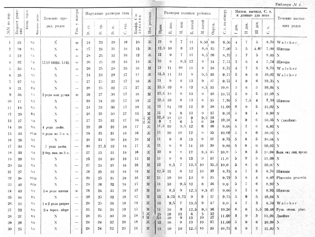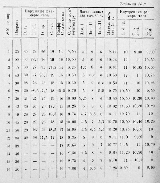 Определяя по этому способу и тинную кон'югату у 28 рожениц в Род. Доме им. проф. Сеченова на Арбате и у 30 женщин в сельской больнице с. Тесово, Сычевского у., Смоленской губ., мы получили данные часть которых скомбинирована на прилагаемой таблице (таб. № 1). По этим данным можно видеть разницу в результатах определения истинной кон'югаты по величине С. ext. и по предлагаемому мною способу.